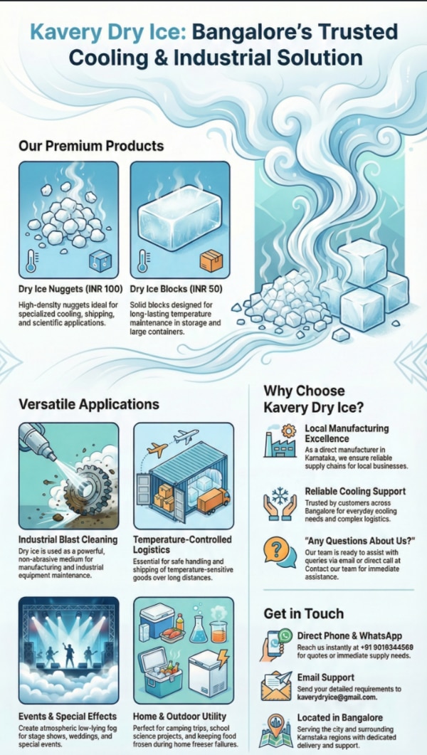 Dry Ice in bangalore dry ice used for Blast Cleaning Manufacturing & Storage Containers Safe Handling Shipping Fog Special Effects Science/School Traveling/Camping Broken Freezer Other Uses Selling Dry Ice History of dry ice Dry I...Read More